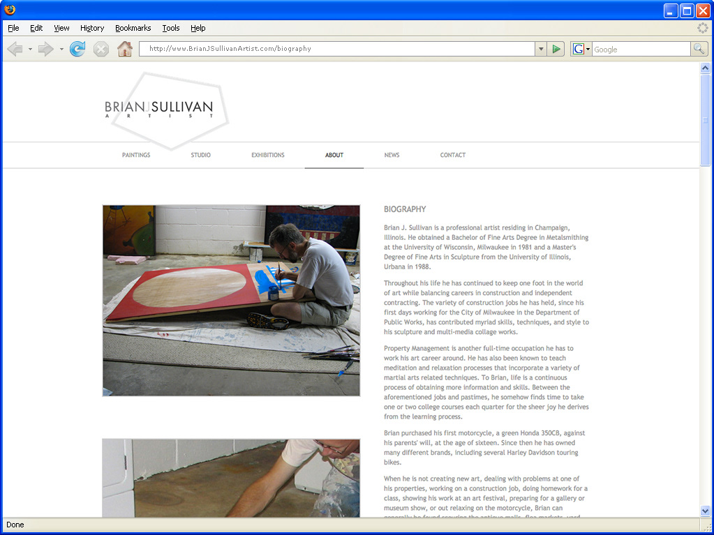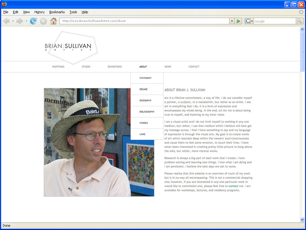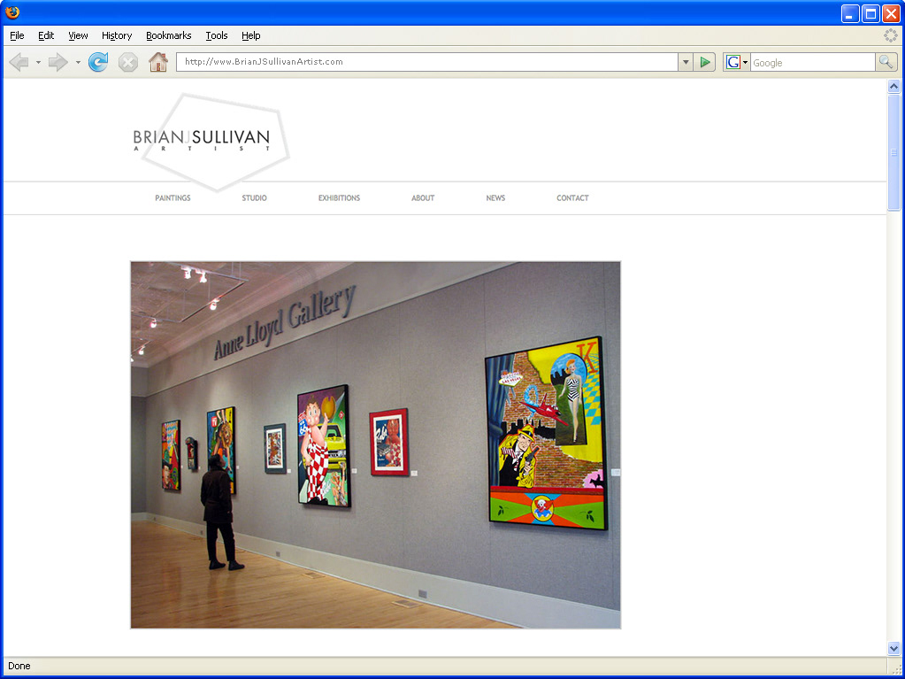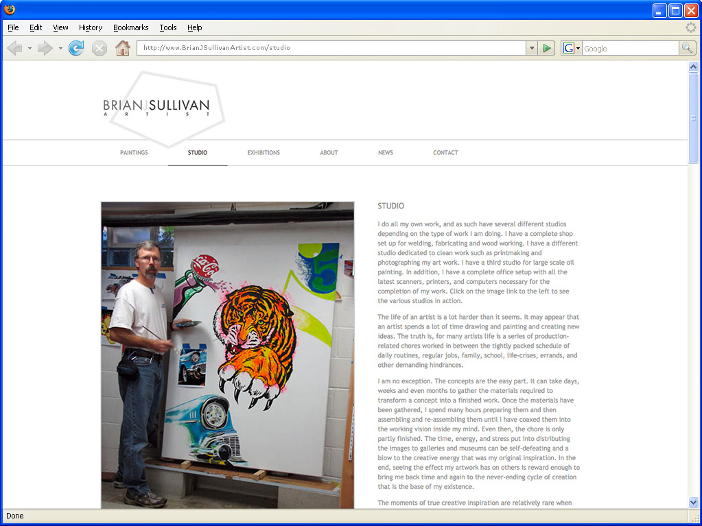 Project for Graphic Design class. An actual client, artist Brian J. Sullivan, needed his website redesigned; each student in the class designed and coded a working site for Brian. Mine was chosen by the artist to be the one he implemented, and it is now up and running at http://www.briansullivanart.com.