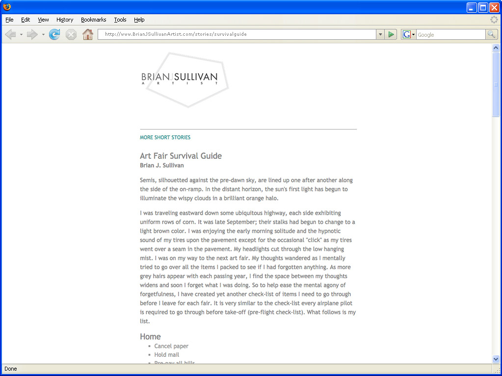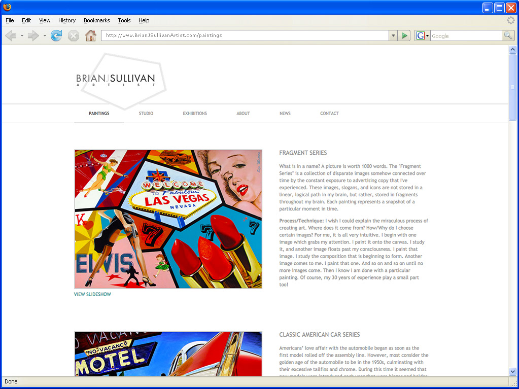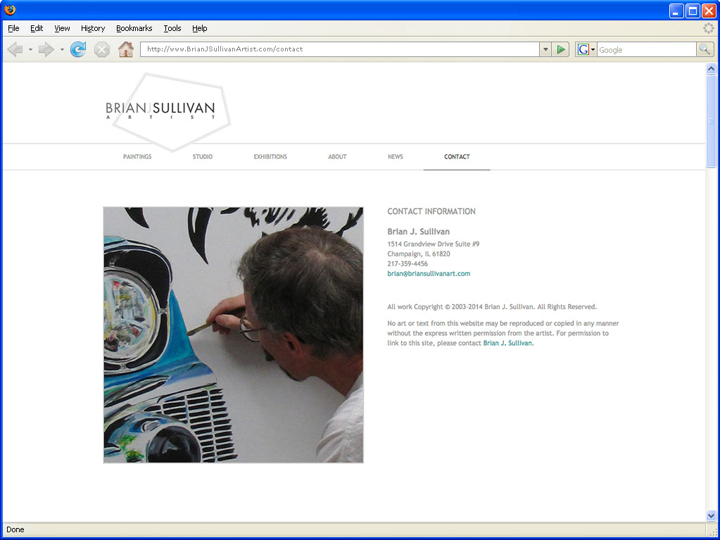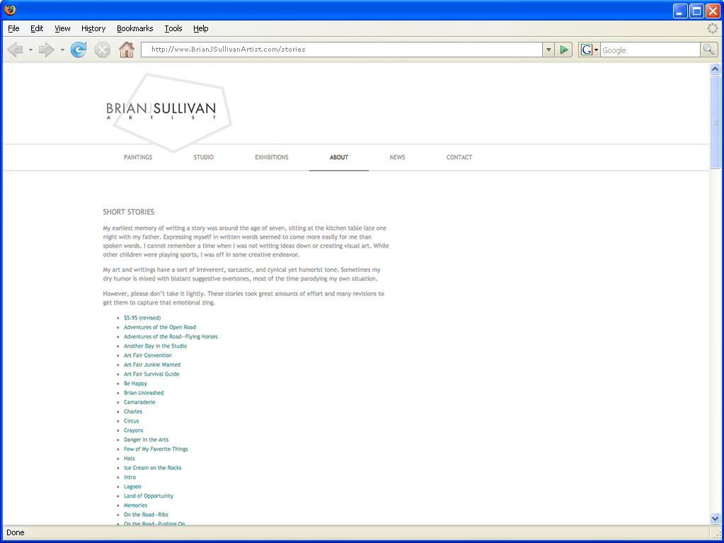 Project for Graphic Design class. An actual client, artist Brian J. Sullivan, needed his website redesigned; each student in the class designed and coded a working site for Brian. Mine was chosen by the artist to be the one he implemented, and it is now up and running at http://www.briansullivanart.com.